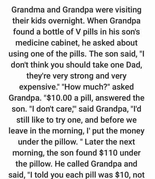 The son said, “I don’t think you should take one Dad, they’re very strong and very expensive.” “How much?” asked Grandpa. “$10.00 a pill, answered the son….
