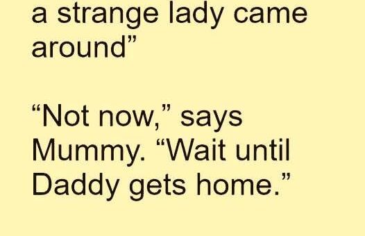 A little girl says to her mother: “Mummy, when you were away at work a strange lady came around”… “Not now,” says Mummy. “Wait until Daddy gets home.” So they wait until Daddy gets...