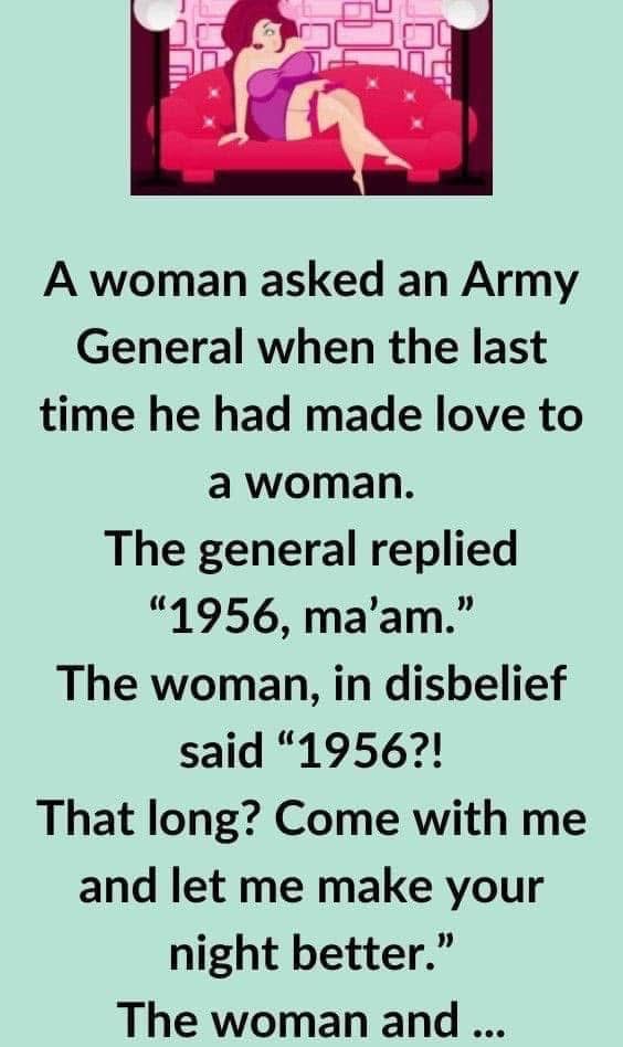 A woman and army general…Brilliant continuation in the first comment The woman, in disbelief said “1956?! That long? Come with me and let me make your night…